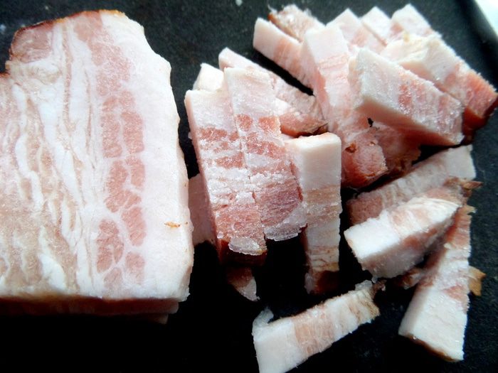 Бекон или ветчину нарезать соломкой. Можно и ветчинную колбаску взять!