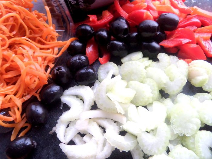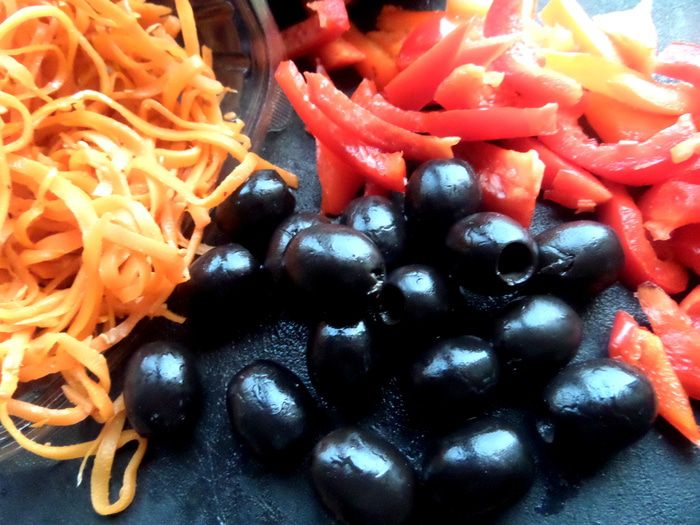 Морковь у меня уже была со специями, но можно и обычную натереть соломкой. Перец тоже соломкой, маслины нарезать кружками.