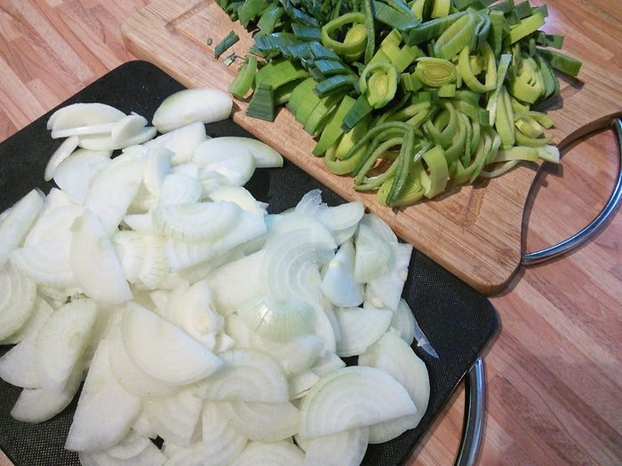 Лук очистила, порезала полукольцами. Я добавила лук-порей, хотя его нет в оригинальном рецепте. Мне показалось, что он не помешает. Порей порезала кольцами.