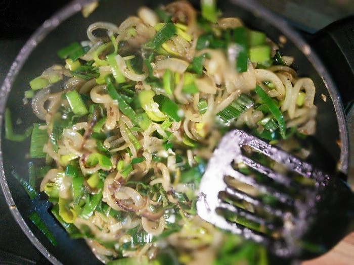 Добавила порей, когда он осел( стушился) добавила сахар, закарамелизировала лук,