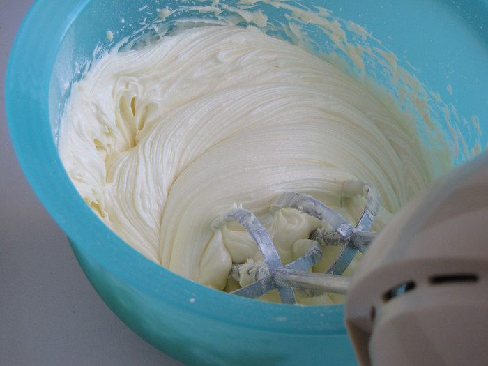 При помощи миксера взбить 200 г. размягченного сливочного масла вместе с сахарной пудрой в пышную массу. Я взяла чуть меньше сливочного масла.
