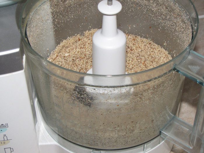 Миндаль измельчить в кухонном комбайне.