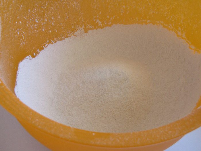 В другую миску просеять муку. Я на всякий случай добавила разрыхлитель.