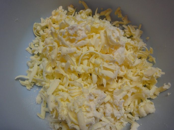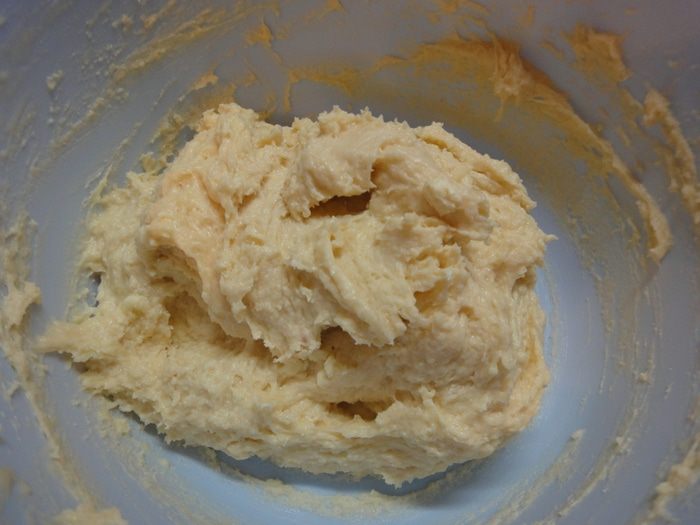 К маслу добавить муку, соль, 1,5 ч.л. сахара и все, что вы смешали в шаге 2. Быстро все перемешать ложкой.