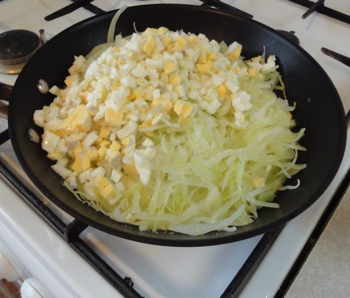 Готовим начинку. Капусту нашинковать, залить водой, довести до кипения. Откинуть на дуршлаг. В сковороде растопить сливочное масло, добавить капусту и нарезанные отварные яйца. Начинку прогреть и остудить.