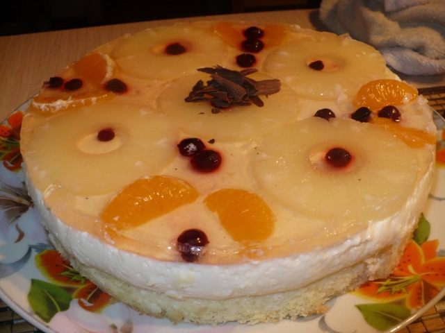 Заливаем фруктовым желе верх и ставим в холодильник для полного застывания всего торта. Потом снимаем кольцо и готово. Я делала 2 торта сразу, поэтому здесь фрукты немного по другому разложены, а принцип тот же.