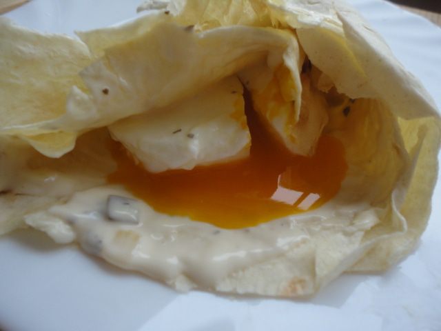 Лаваш смазать соусом и выложить яйцо. Свернуть конвертиком.
