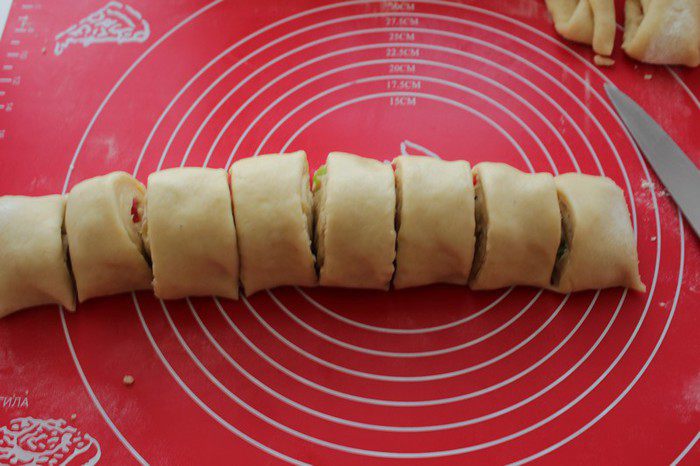 Сверните тесто в плотный рулет и нарежьте на кусочки толщиной 4-5 см.