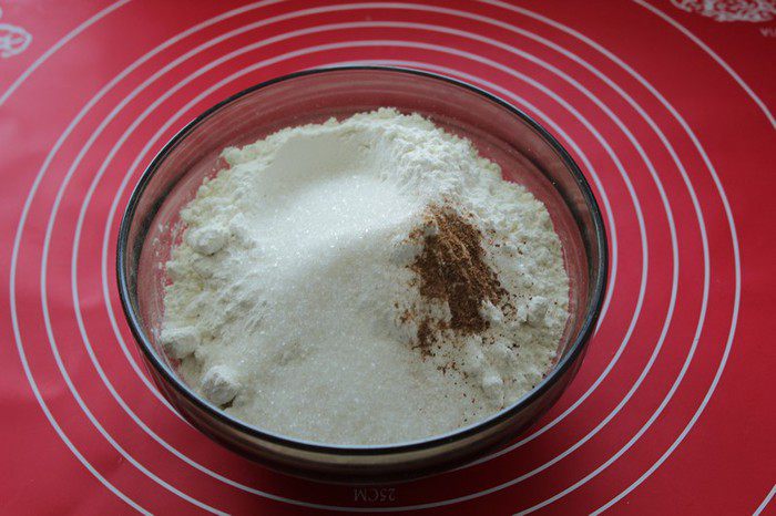 Взбитое яйцо добавьте к сухой смеси. Затем добавьте молоко с разведенными дрожжами, замесите тесто до полуготовности.