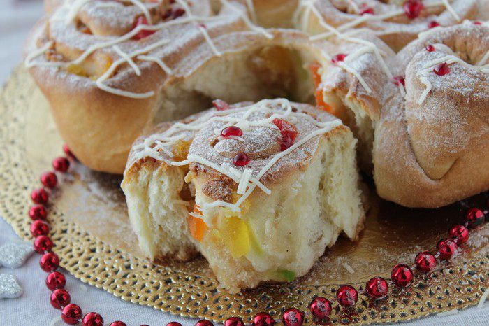 Раскатайте тесто в прямоугольник. Выложите цукаты и нарезанный небольшими кусочками марципан.
