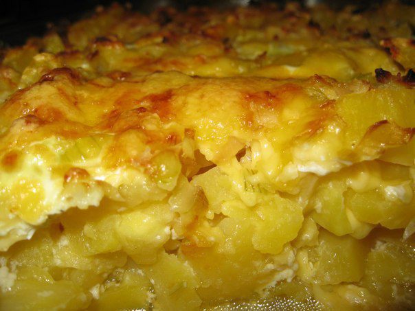 Ломтики картофеля и кабачков уложить слоями в смазанную маслом форму. Кабачок, картофель, тертый сыр, кабачок, картофель.