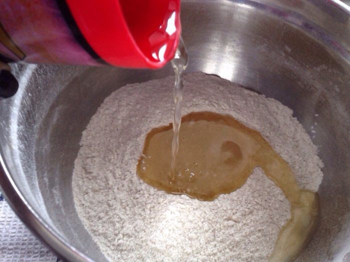 Воду соединить с растительным маслом и влить к сухим ингредиентам.