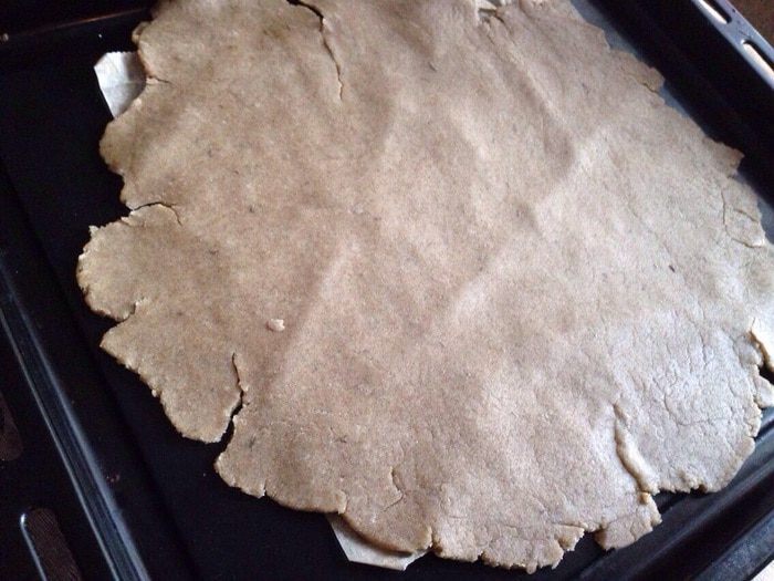 Тесто тонко раскатать на присыпанной мукой рабочей поверхности. Потом аккуратно перенести на противень застеленный бумагой для выпечки.