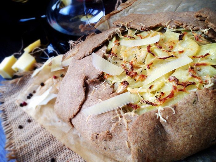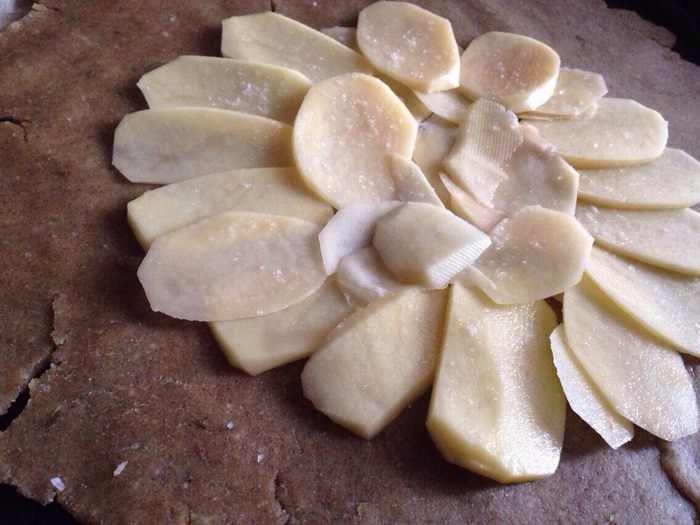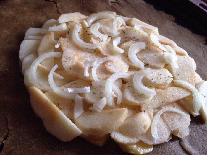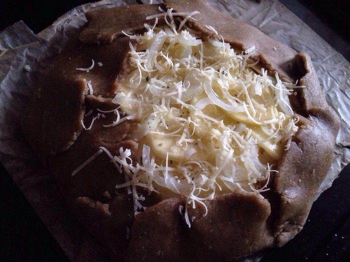 И последний слой картофеля, лука, чуть соли, тимьян и перец. Завернуть внутрь края галеты. Сверху начинки положить несколько кусочков сливочного масла и присыпать все тертым сыром (на ваш вкус).