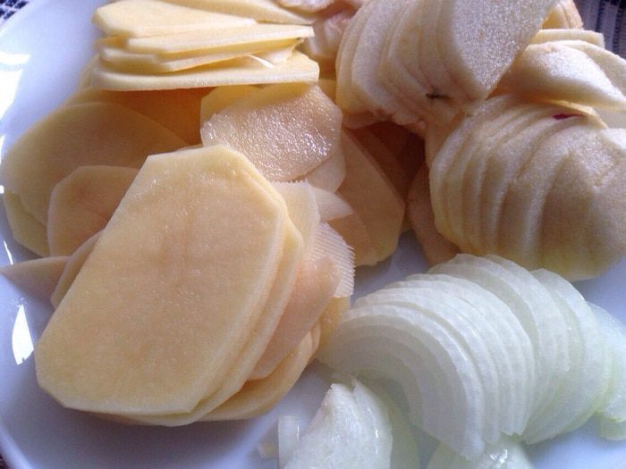 Яблоки (1-2шт.) и картофель (2-3шт.) вымыть, очистить, нарезать тонкими слайсами. Лук (не большой) полукольцами.