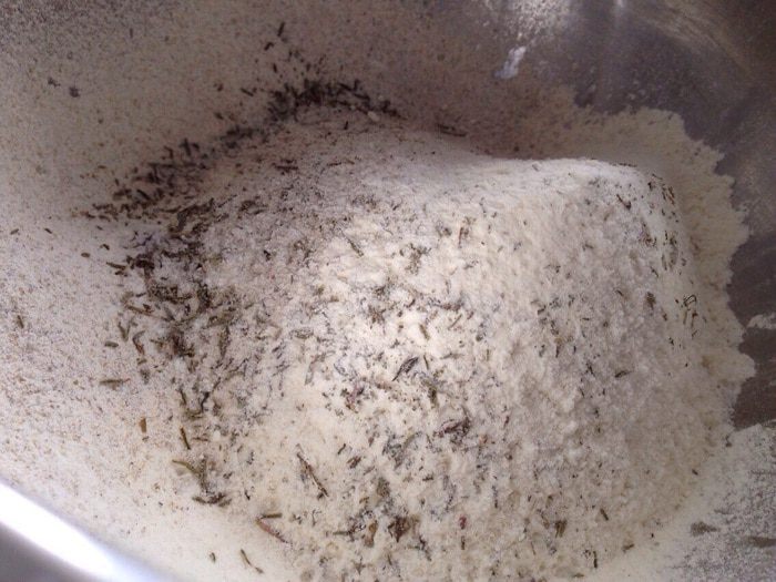 В миску просеять два вида муки, добавить соль, тимьян и розмарин. Перемешать.