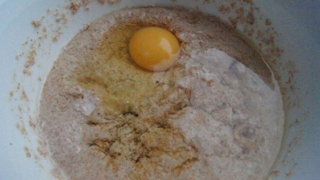 К набухшим отрубям добавить яйцо, мед и растительное масло. Перемешать.