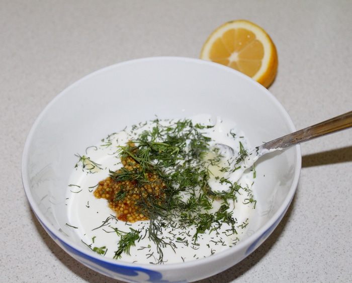 И приготовить соус: смешать сметану, горчицу, соль, укроп, немного перца.