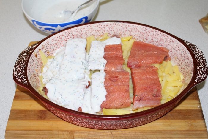 Вынуть форму, выложить филе рыбы, залить все сметанным соусом.