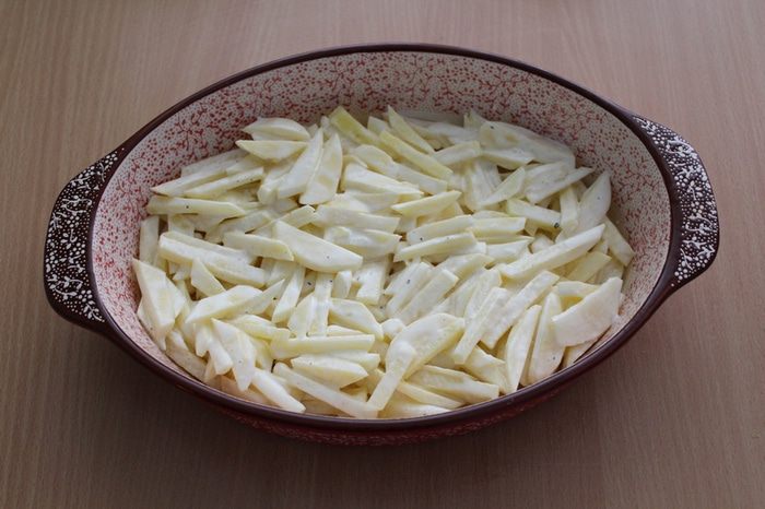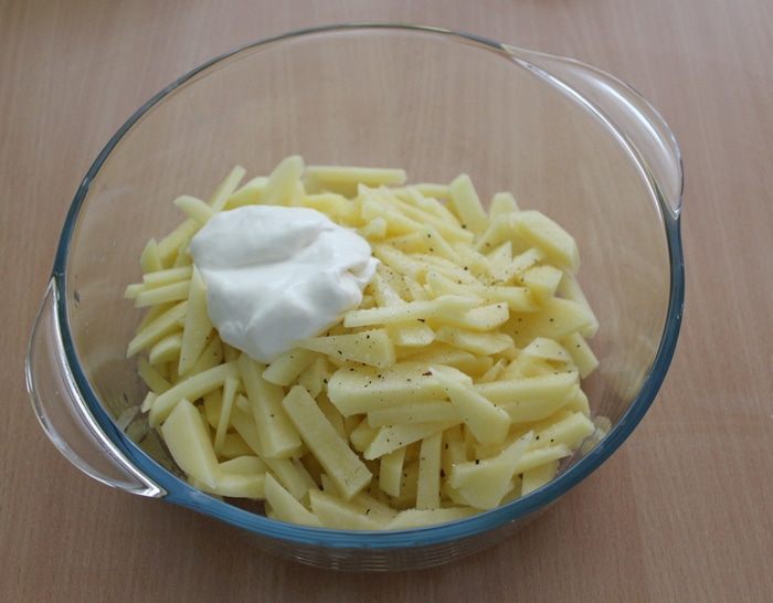 Небольшой картофель почистить и порезать тоненькой соломкой, поперчить, посолить по вкусу, добавить сливки.
