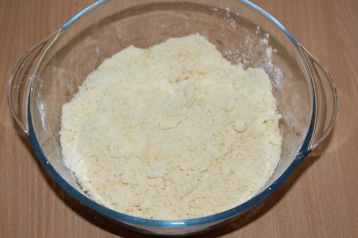 В это время приготовим крамбл: в муку добавить охлажденное масло и перетереть руками.