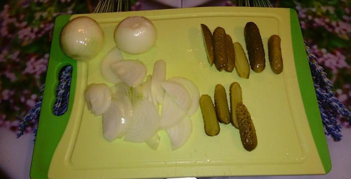 Огурцы нарезать примерно также, лук - полукольцами.