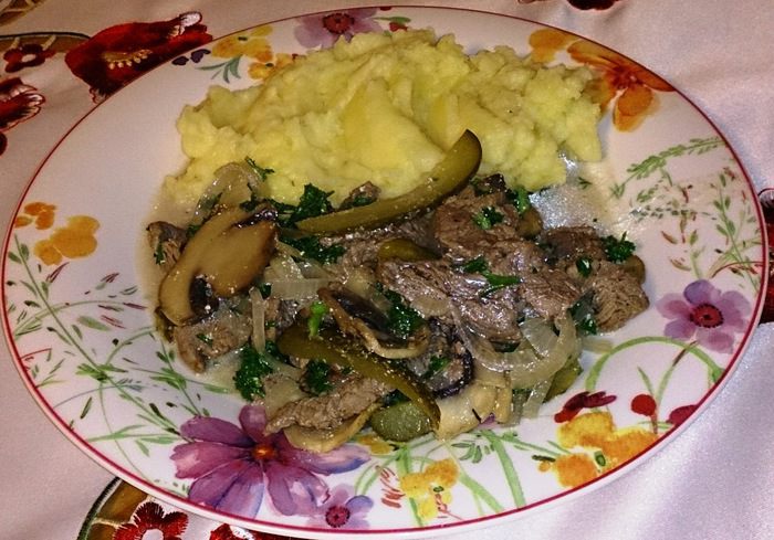 Затем добавить сметану, приправить солью, перцем и сахаром. Выложить мясо и проварить все вместе еще пару минут. Смешать с рубленой петрушкой и сразу же подавать на стол.