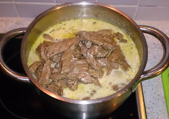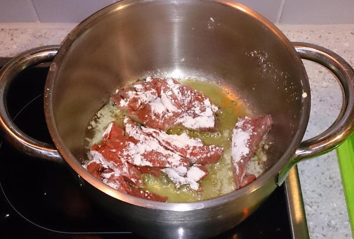 Обвалять говядину в муке и обжарить порционно в горячем масле несколько минут. Выложить в отдельную емкость и поставить в теплую духовку, нагретую до 80 градусов.