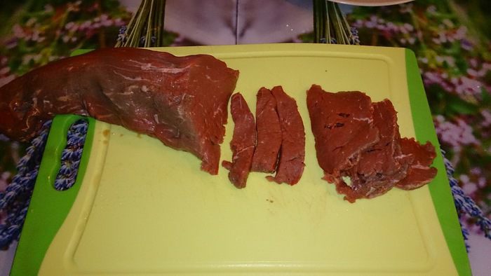 Нарезать говядину на небольшие кусочки толщиной 4мм, длиной ок. 5см.