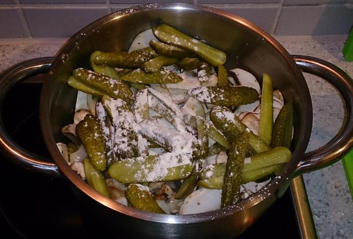 В кастрюлю выложить лук, шампиньоны, огурцы, посыпать мукой. Залить мясным бульоном и тушить на медленном огне 15 минут.