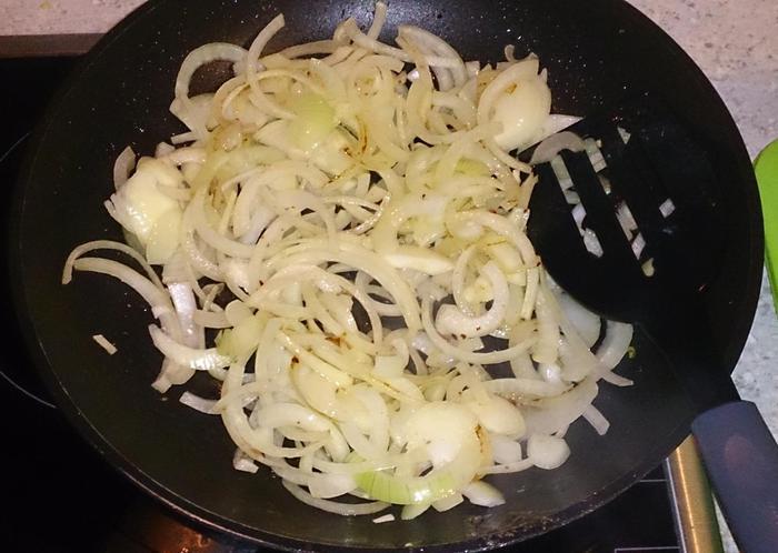 Обжарить лук.