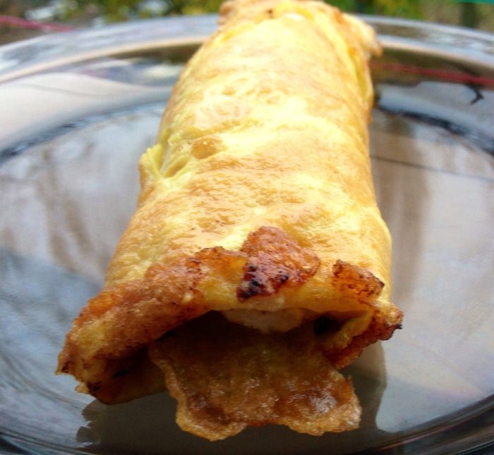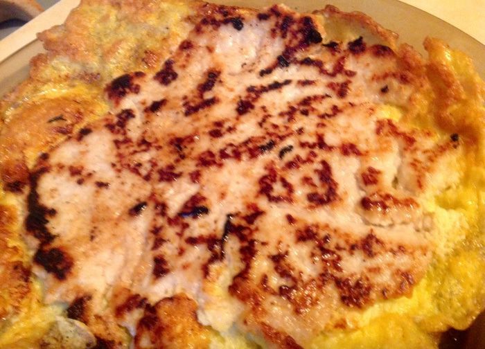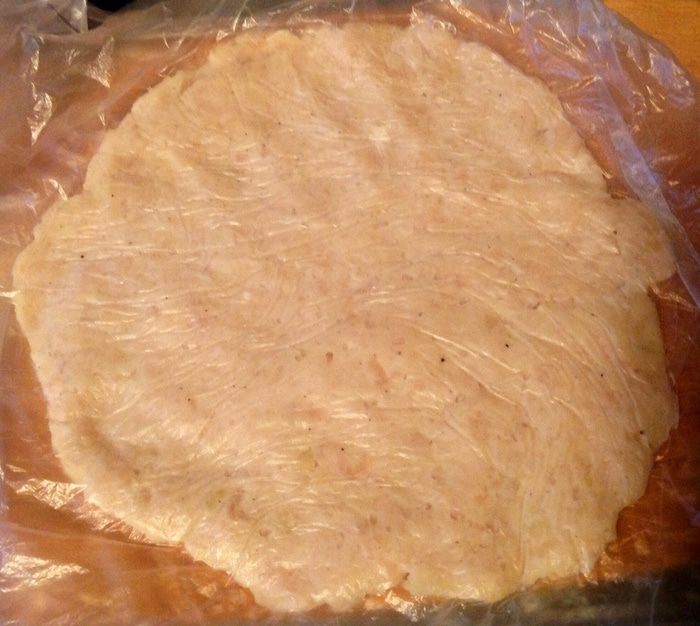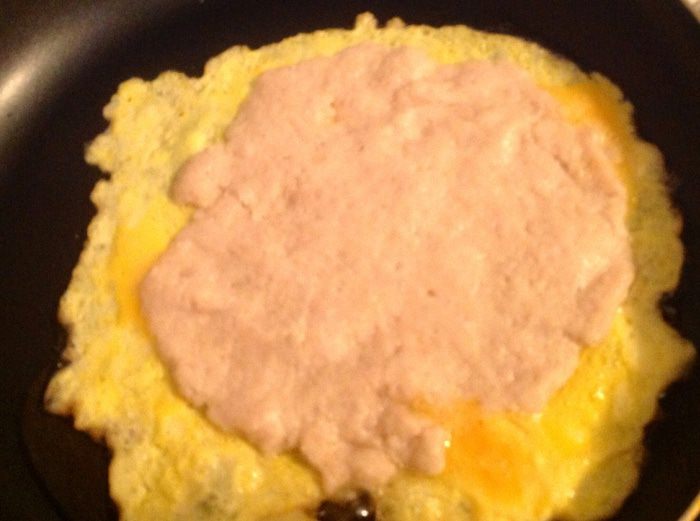 На разогретую сковороду с растительным маслом, мы выливаем яйца (не все), поджариваем слегка и потом выкладываем лепешку из фарша сверху, делала я это так: засунула одну руку в пакетик, как бы взяла лепешку на ладонь, второй рукой аккуратно отлепила прилипший к фаршу пакетик и с ладони опустила лепешку на яйца.