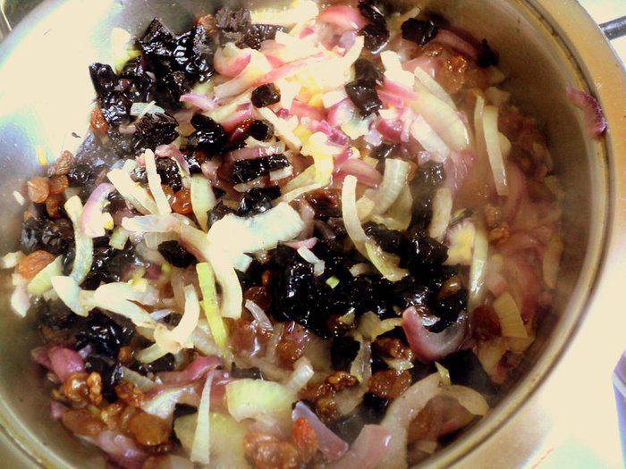 Чернослив и изюм промыть горячей водой, чернослив порезать небольшими кусочками. Добавить изюм и чернослив к луку и тушить под крышкой 5 минут.