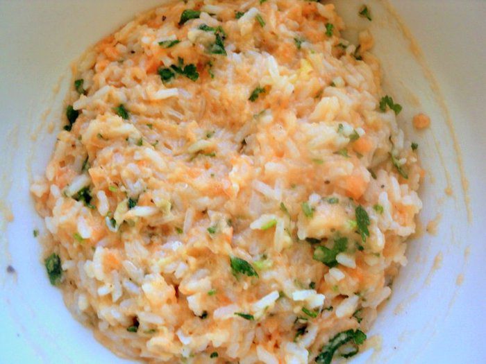 Филе семги измельчить в блендере. Рис отварить до готовности, слить воду и охладить. Добавить в фаршу вареный рис, натертый на терке лук, мелко нарезанную петрушку, соль, перец и специи для рыбы по вкусу. Хорошо перемешать фарш и выбить для придачи ему однородной вязкой массы.