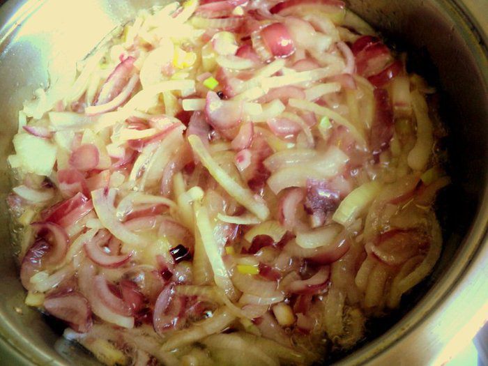 Приготовим соус. Лук порезать четверть кольцами и пассировать на растительном масле до прозрачности.