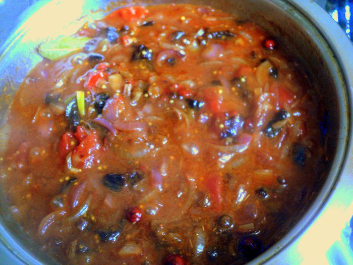 Затем добавить помидоры в собственном соку, специи, соль и перец. Тушить еще 2 минуты. Добавить горчицу с зернами, яблочный уксус, сахар. Долить, если необходимо, немного горячей воды и тушить 2-3 минуты.