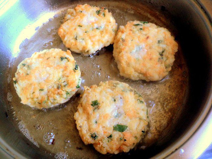 Сформировать из фарша небольшие котлетки, панировать в муке и поджарить на растительном масле с двух сторон до румяной корочки.