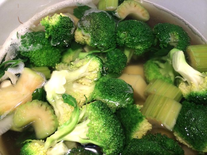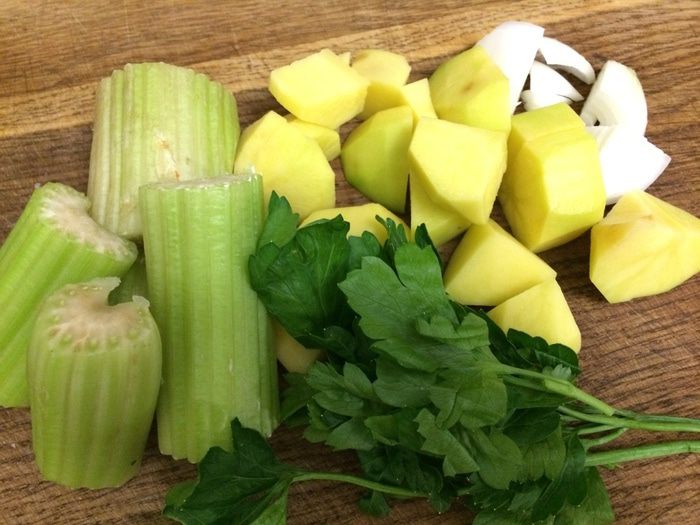 Подготовить все овощи: брокколи помыть и разбрать на соцветия, сельдерей и петрушку помыть, картофель и лук почистить. Лук, картофель и сельдерей нарезать крупными кусочками.