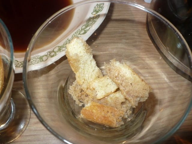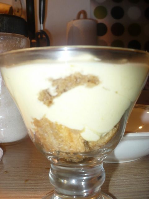 Окунаем бисквит в кофе и выкладываем в креманку.