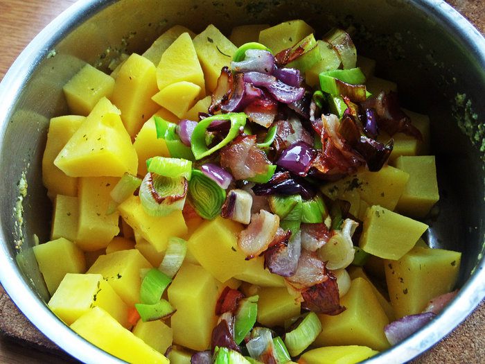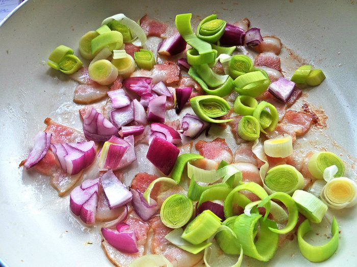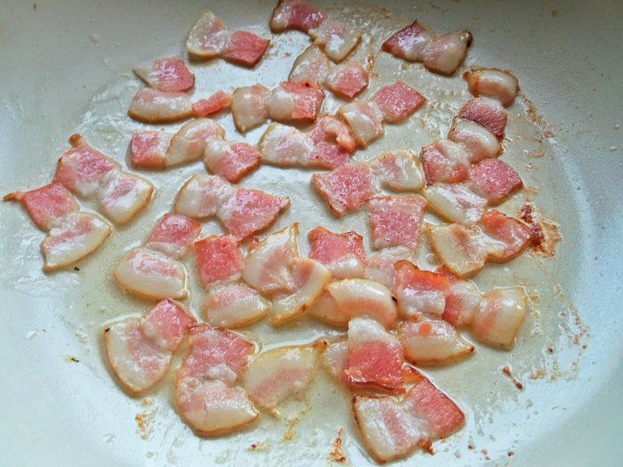Высыпать их к бекону. Часть бекона отложить для украшения.
