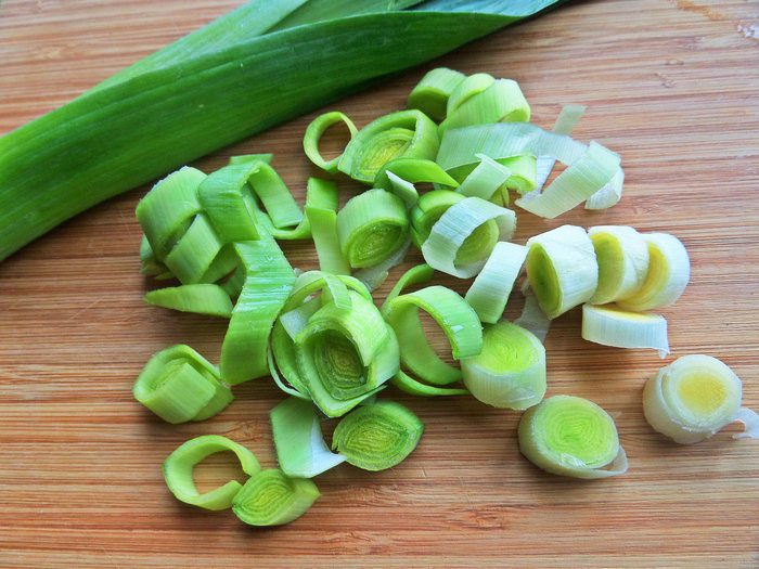 Лук-порей нарезать кольцами, красный лук измельчить.
