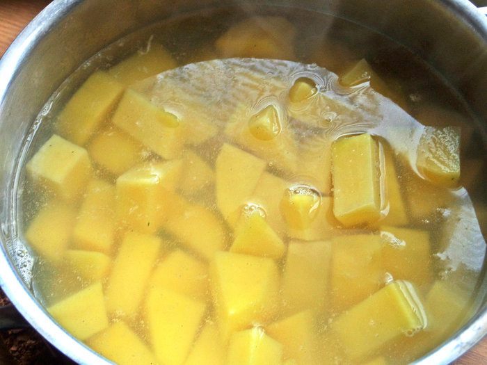 Картофель в это время сварился, слить лишний отвар в кружку, а в картошку высыпать содержимое сковороды.