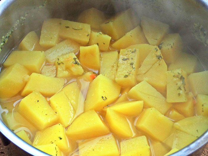 Две крупные картофелины я очистила и нарезала для быстроты крупными кубиками.