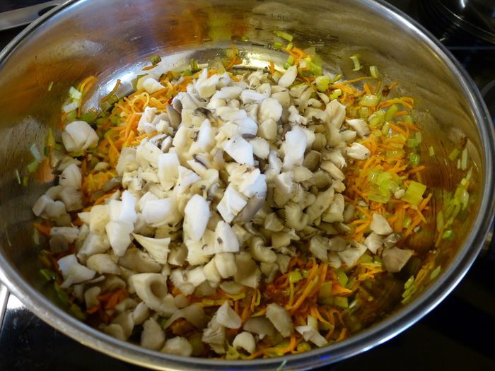 Добавляем нарезанные вешенки и обжариваем на среднем огне еще 10-15 минут.