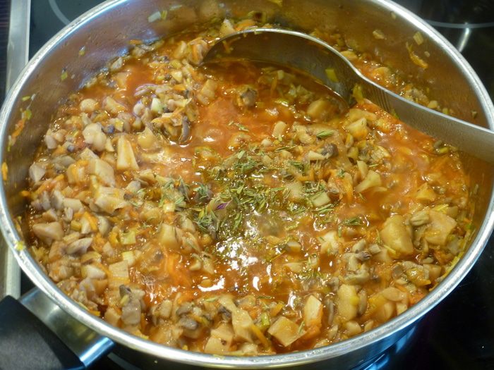 Добавляем томатную пасту, воду, соль, сахар, винный уксус и листочки тимьяна ( я использовала сухой). Тушим икру еще минут 15.