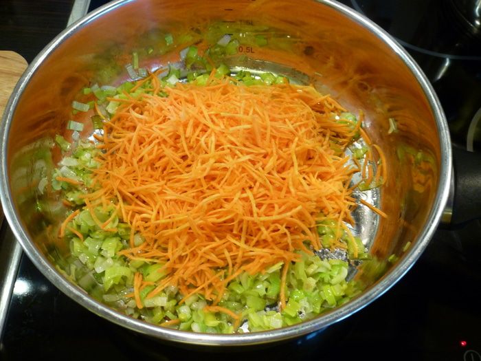 Шинкуем лук-порей, натираем морковь. На растительном масле обжариваем лук 3 минуты, добавляем морковь и обжариваем еще 3 минуты.