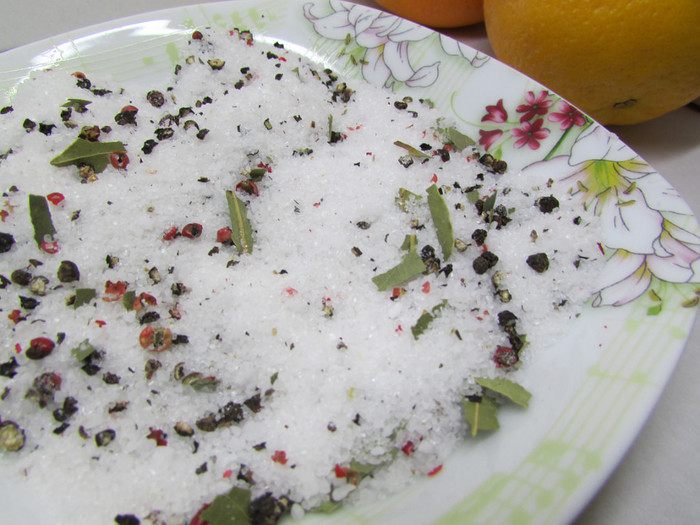Раздавите розовый и черный перец. Лавровый лист поломайте. Соедините соль, сахар, лавровый лист и смесь перцев. Хорошо перемешайте.