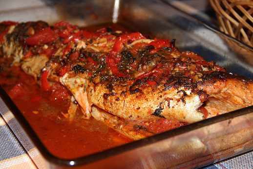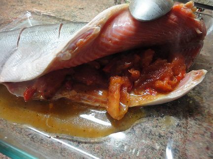 Подготовить заливку. В сковороде разогреть масло и в течении полуминуты обжаривать измельченный чеснок в тмином и паприкой. Добавить нарезанные кусочками помидоры и болгарский перец, влить сок от помидор. Я не солила, т.к. помидоры с соком были достаточно солеными. Довести до кипения и убрать с плиты. Часть овощей выложить в середину тушки.
