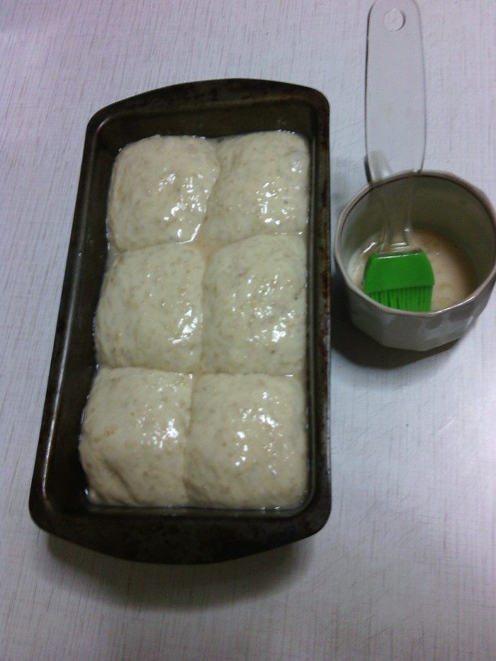 Тесто разделить на 6 равных частей, скатать шары. Форму смазать растительным маслом, равномерно разложить шары из теста.