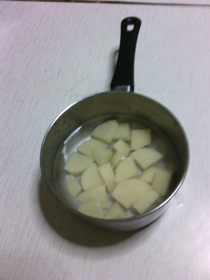 Картофель отварить до готовности. Затем размять в пюре, немного остудить.